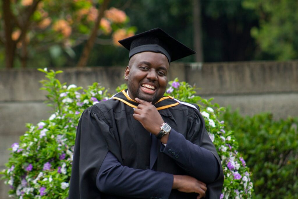 A happy Panashe smiling while donning his Academic Regalia